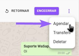 - Basta acessar o menu de opções no canto superior direito da conversa e selecionar a opção “Agendar”.